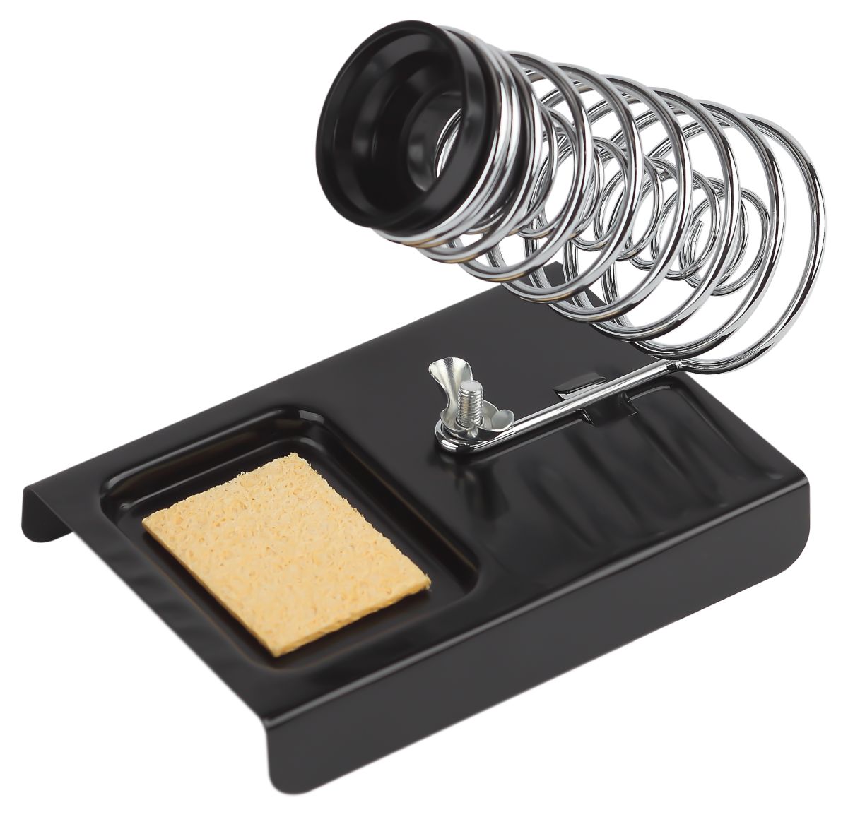 Паяльник легко и удобно умещается в направляющую закреплённую на устойчивой штампованной платформе с ложементом под губку. Губка для очистки жала от припоя идёт в комплекте.