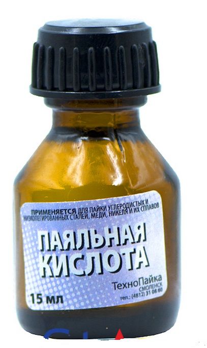 Состоит из хлорида цинка и воды. Применяется для снятия загрязнений и сильно окисленной оболочки с поверхности металлических деталей, для лучшего их скрепления при пайке. Используется при пайке меди, никеля и их сплавов. Хранится в стеклянной бутылочке. Объем бутылочки 18 мл. Упакован по 10 штук.