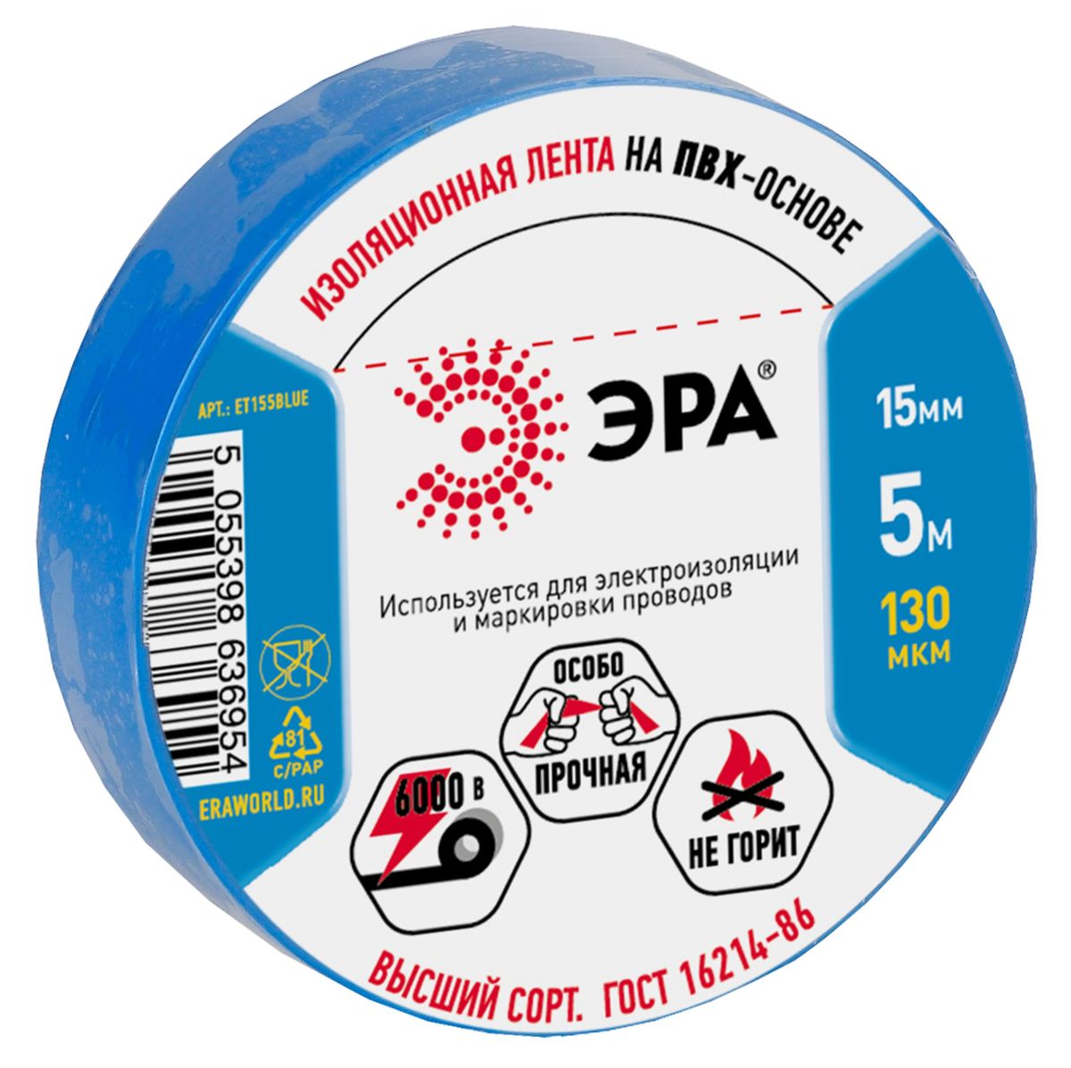 Читать все статьиИзолента ЭРА ET155BLUE ПВХ 15мм х 5м синяя
