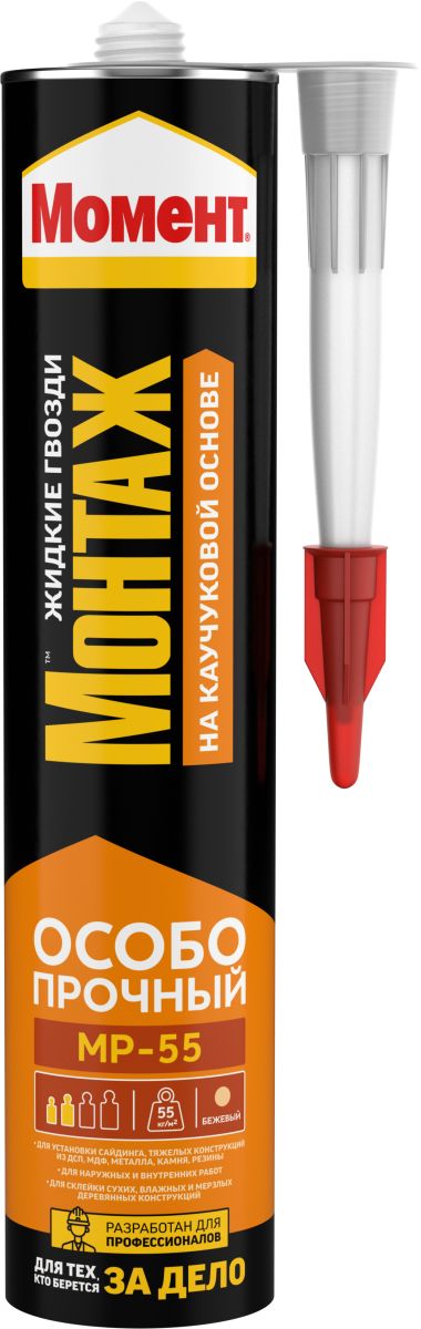 Монтажный клей Момент Монтаж Особопрочный МР-55 специально создан для применения во всех областях домашнего строительства и ремонта. Используется с большинством известных материалов. Высокая первоначальная сила склеивания - 55 кг/м2. Легкий в использовании и эксплуатации! Быстрое схватывание. Водостойкий. Обеспечивает хорошую адгезию с широким диапазоном строительных материалов. Компенсирует незначительные неровности поверхности при склеивании. Снижает звукопроницаемость. В неотверждённом состоянии легко удаляется. Не подходит для полиэтилена, полипропилена, тефлона, материалов, разрушаемых растворителем, входящим в состав клея.