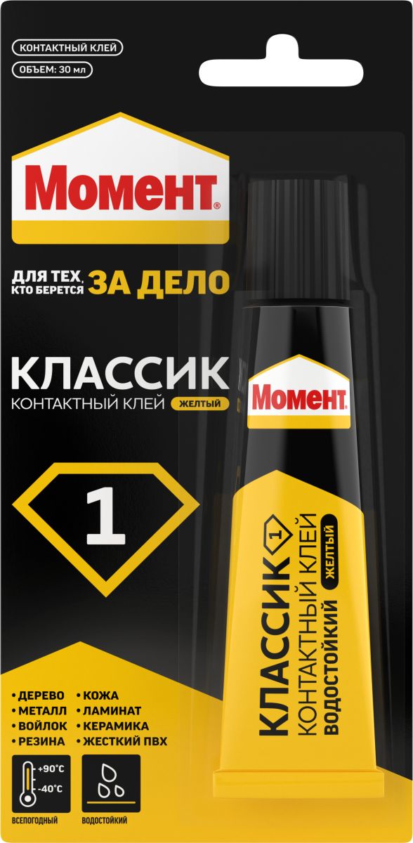 Клей Момент-1 422971 является водостойким и предназначен для склеивания в различных сочетаниях дерева, металла, кожи, резины, войлока, декоративно-слоистых пластиков, стекла, керамики, фарфора. Основа - синтетический каучук. Клеевой шов получается очень надежным. Нельзя использовать для посуды, контактирующей с пищей. Необходимо хранить при температуре о -20ºС до +30ºС. Если клей замерз, то свои свойства он восстановит при комнатной температуре. Поставляется на блистере. Срок годности — 24 месяца.