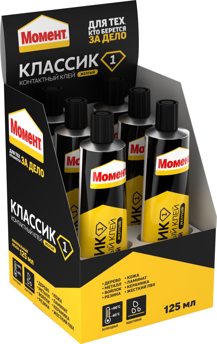 Момент 1 Классик является испытанным и надежным решением как для ремонта, так и для производства клеенных изделий. Универсальный водостойкий контактный клей для склеивания разных материалов. - Образует эластичный клеевой шов - Обладает высокой адгезией к большинству материалов - Водостойкий и морозостойкий
