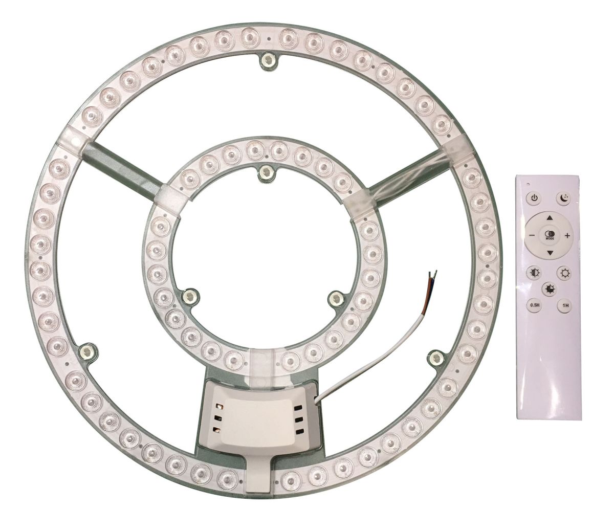 Компания ЭРА разработала и выпустила серию универсальных компонентов светодиодные модули с пультом управления. Данная разработка предназначена для замены штатных элементов или для установки в светильники, в которых источником света служила стандартная лампа. Светодиодный модуль выступает как сменный элемент, который может подойти к рассеивателям любого дизайна. Благодаря наличию пульта управления можно менять цветовую температуру в диапазоне 3000 7000 К, что позволяет использовать светодиодный светильник в помещениях с широким функционалом: от уютной спальни до строгого офиса. Корпус изготовлен из металла, в него встроен LED-модуль. Диаметр светильника составляет 31 см, мощность лампы 24 Вт, срок службы лампы составляет 30000 часов.