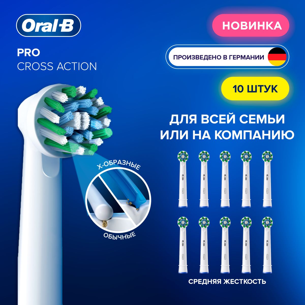 Оригинальные сменные насадки Oral-B PRO Cross Action для электрических зубных щеток Oral-B созданы совместно со стоматологами для эффективной ежедневной гигиены полости рта. Адаптивные Х-образные щетинки проникают во все участки полости рта, удаляя до 100% больше зубного налета и обеспечивая глубокое очищение там, куда не дотягиваются обычные круглые щетинки. Универсальная насадка PRO Cross Action совместима со всеми щетками Oral-B (подходит для всех моделей электрощёток Oral-B Braun, за исключением Pulsonic, iO). Сделайте выбор в пользу Oral-B — марки зубных щеток № 1, используемой большинством стоматологов в мире*. Особенности насадок Oral-B PRO Cross Action: • Адаптивные X-образные щетинки достигают труднодоступные участки полости рта; • Тонкие перекрестные щетинки средней жесткости, расположенные по кругу под углом 16 градусов, легко проникают в межзубные промежутки и удаляют налёт даже в труднодоступных местах; • Улучшают состояние десен, массируя их в процессе чистки, подходят для ухода за чувствительными зубами и деснами; • Благодаря технологии Clean Maximizer щетинки меняют цвет с зеленого на желтый, сигнализируя о необходимости сменить насадку; • Количество насадок в упаковке - 10шт (запас на 2,5 года); • Каждая насадка находится в индивидуальной упаковке: удобно хранить и разделять с членами семьи. Мы рекомендуем использовать только оригинальные насадки Oral-B, произведенные в Германии, для наилучшей эффективности чистки.