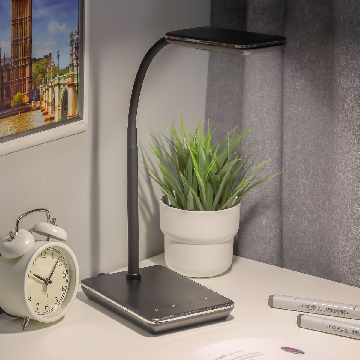 Светильник со светодиодами (LED) в качестве источников света. Выбор цветовой температуры - 3 цвета: 3000К, 4500К, 6000К. Сенсорное переключение. Пятиступенчатый диммер для регулировки яркости. Устойчивое плоское основание. Направление света регулиру