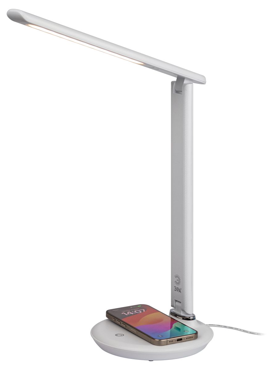 Складной настольный светильник ЭРА NLED-504 с фактурой поверхности "под кожу" белого цвета имеет 3 режима свечения (теплый, нейтральный и холодный свет), сенсорное управление и плавную регулировку яркости, дополнительно оснащен USB портом для зарядки устройств и модулем Qi для беспроводной зарядки. Просто положите телефон, поддерживающий функцию Qi, на основание светильника в отмеченной зоне - светильник подзарядит его. У светильника плафон с регулировкой высоты для удобного напраления света и устойчивое утяжеленное основание с противоскользящими накладками. Поставляется в индивидуальной картонной коробке.