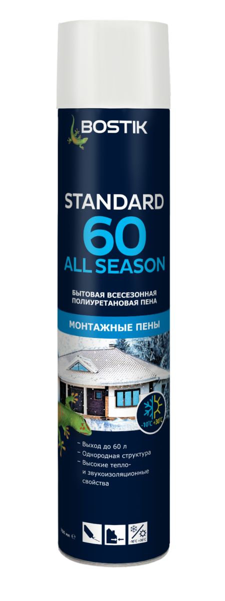 Bostik STANDARD 60 - однокомпонентная бытовая полиуретановая пена соединяет и держит отдельные элементы строительных конструкций между собой для утепления и звукоизоляции. ЗОНА ПРИМЕНЕНИЯ Используется для заполнения стыков и пустот, герметизации, уплотнения и фиксации при установке окон и дверей, монтаже изоляционных материалов, стеновых панелей, кровельных листов и других строительных материалов.