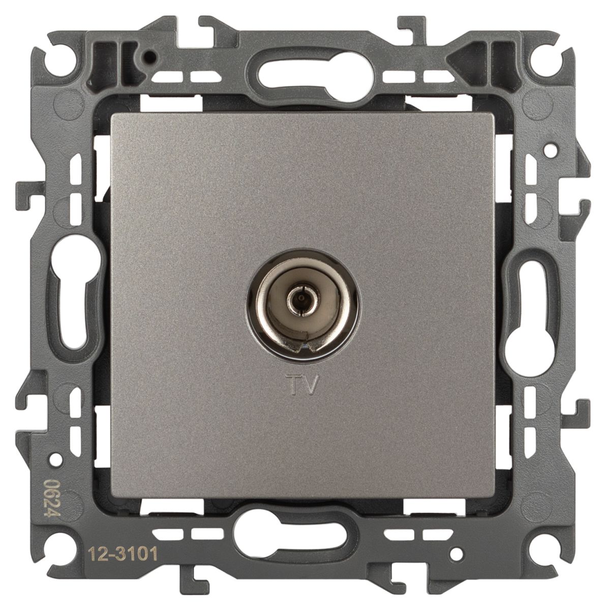 Розетка телевизионная одиночная серии Эра 12 скрытой установки механизм цвет титан 12-3101-16. Сделана из поликарбоната. Монтаж в подрозетник производится и на лапки, и на винты. Рамки приобретаются отдельно.
